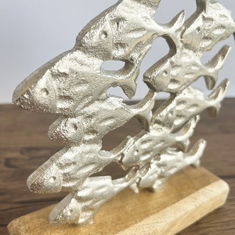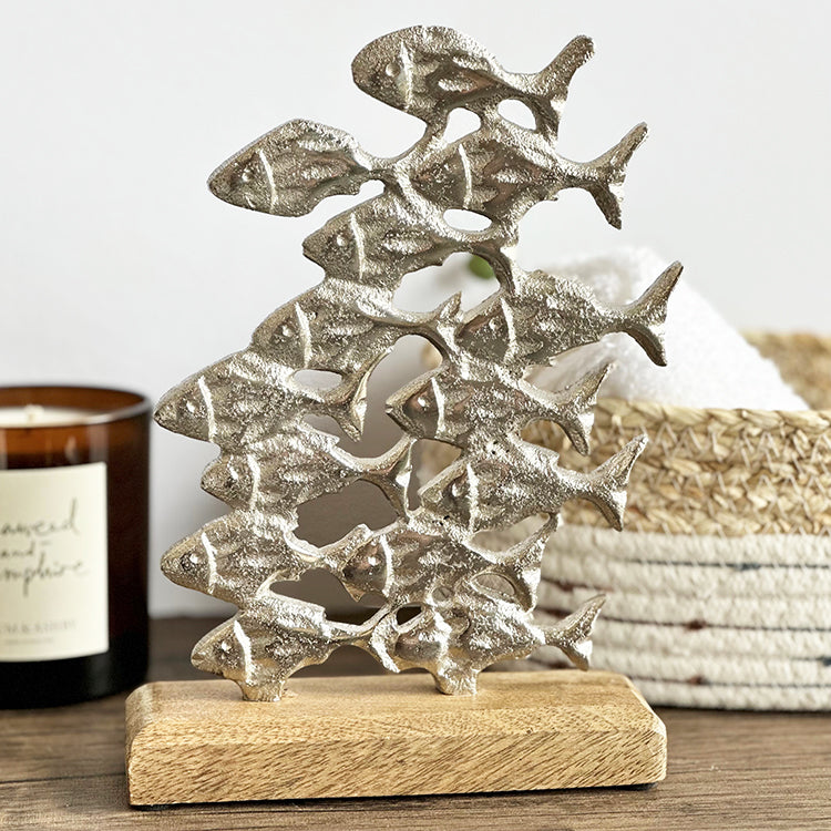 This beautiful silver school of fish sits on a driftwood-style piece of wood and is the perfect finishing touch to your coastal inspired room.