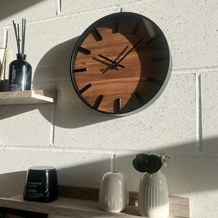 This stunning contemporary wall clock is complete in a dark wood effect, with black detailing making this perfect to suit any home.