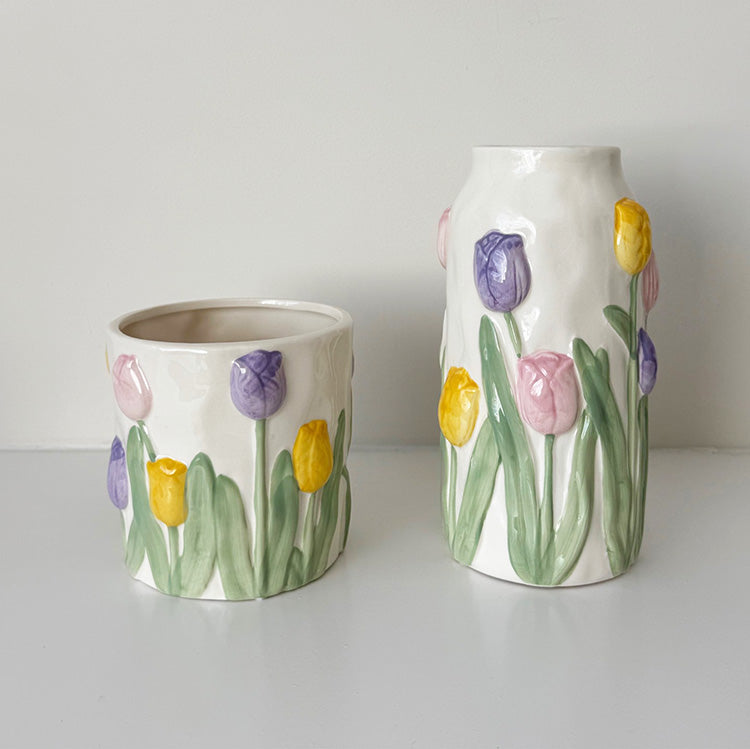 - Featuring a soft pattern with raised colourful tulips, this glossy vase adds visual interest while keeping a clean, minimalist aesthetic.