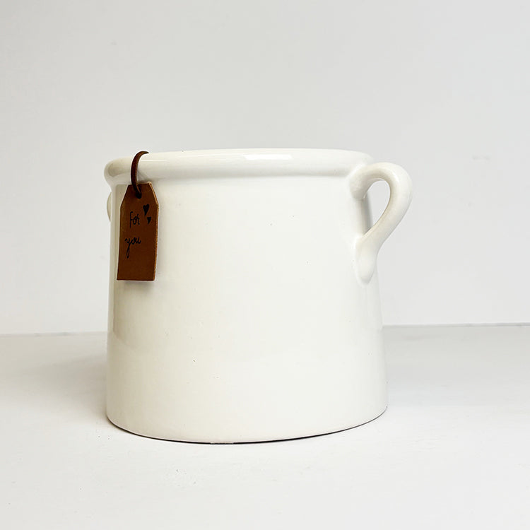 - The milk churn style pots are finished in a white glaze, and comes complete with a little leather tag with a 'For You' quote and love hearts.